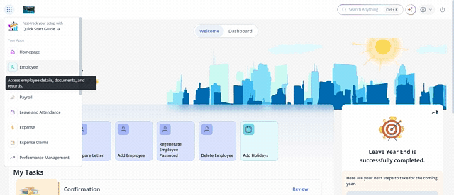 To send a reminder to the employees to complete the open tasks, from the greytHR Admin portal, hover over the 9 dots and select Employee > Admin > Off-boarding.