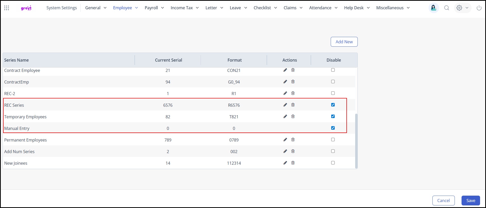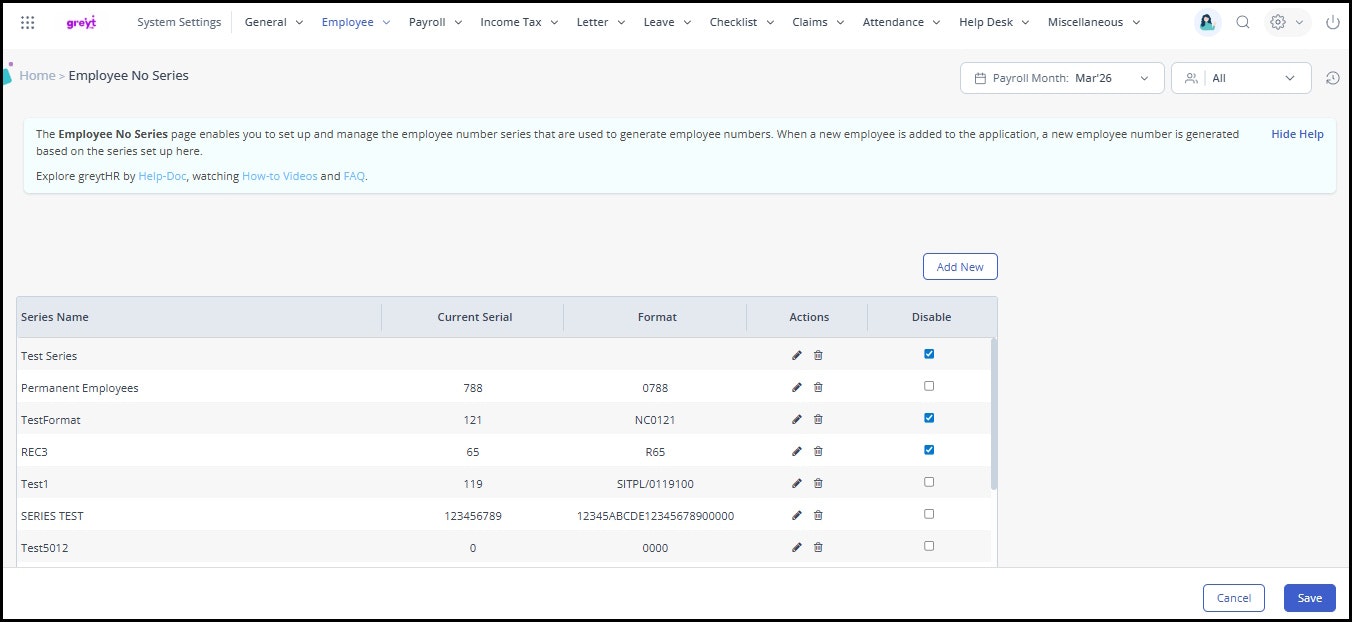 The Employee No Series page in the greytHR Admin portal allows you to set up and manage employee number series that are used to generate employee numbers. The numbers can be numeric and alpha-numeric.
